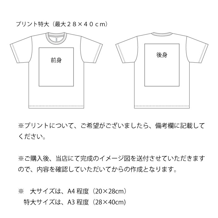 ※ウエアのサイズとプリントの大きさで価格が変わりますので、サイズ種類別とプリント種類別で価格を決めていただき、カラー・サイズを選択してください。
