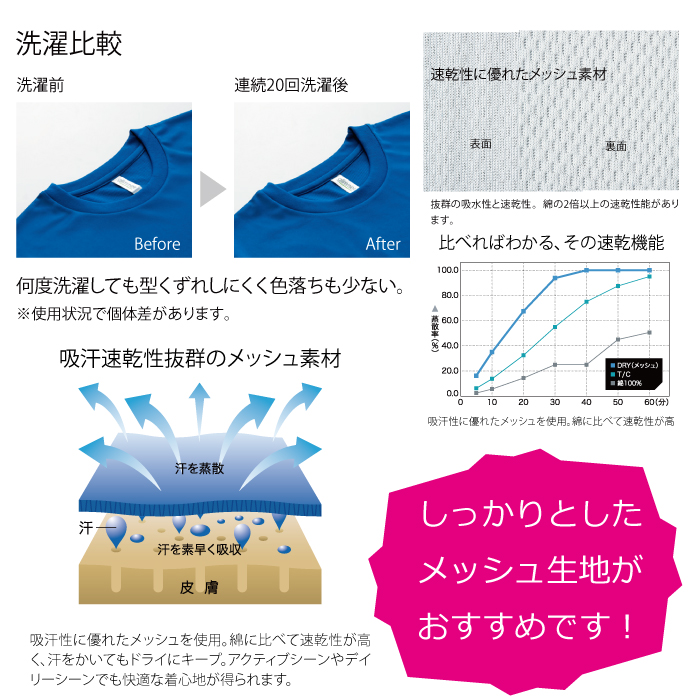 さらさらした、夏におススメのドライTシャツ、洗濯しても色あせしにくい素材ですので、夏の応援用におすすめです。