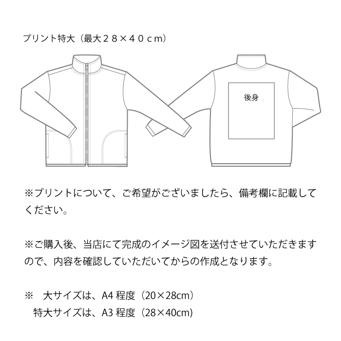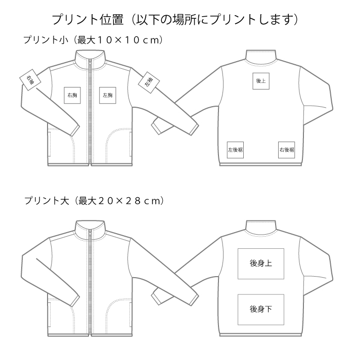 ※ウエアのサイズとプリントの大きさで価格が変わりますので、サイズ種類別とプリント種類別で価格を決めていただき、カラー・サイズを選択してください。